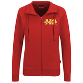 Sportliche Sweatjacke für Damen im College-Stil, mit Raglanärmeln, hochwertigem Frontreißverschluss von YKK®, formstabilen Bündchen mit LYCRA®-Anteil, Kragen mit Kordel und hochwertigen Metallösen von YKK®, Teilungsnähten mit dekorativer Flatlock-Steppung, nicht angerauter Innenseite (French-Terry), Nackenband und zwei praktischen seitlichen Einschubtaschen mit Reißverschluss. Hergestellt aus pflegeleichter Baumwolle-Polyester-Mischung für höchste Ansprüche. Gewebtes HAKRO-Necklabel aus hochwertigem Kettsatin mit weichen, ultraschallgeschnittenen Bandkanten für höchsten Tragekomfort und gewebtes HAKRO-Flaglabel an der linken Seitennaht.