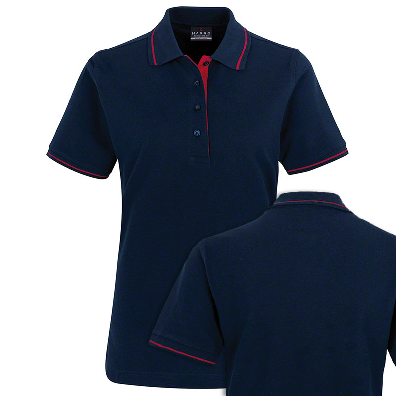 Sportives Poloshirt für Damen, mit Kontraststreifen im Polokragen und an den Ärmelbündchen, hochwertig verarbeiteter, modisch schmaler 4-Loch-Knopfleiste mit extra haltbar angenähten, bruchsicheren Knöpfen, Ton-in-Ton mit dem gelaserten HAKRO Schriftzug. Mit Ersatzknopf, Nackenband und doppelt geriegelten Seitenschlitzen. Hergestellt aus feinmaschigem Piqué aus langstapeliger, gekämmter und ringgesponnener Baumwolle. Gewebtes HAKRO Necklabel aus hochwertigem Kettsatin mit weichen, ultraschallgeschnittenen Bandkanten für höchsten Tragekomfort und gewebtes HAKRO Flaglabel an der linken Seitennaht.