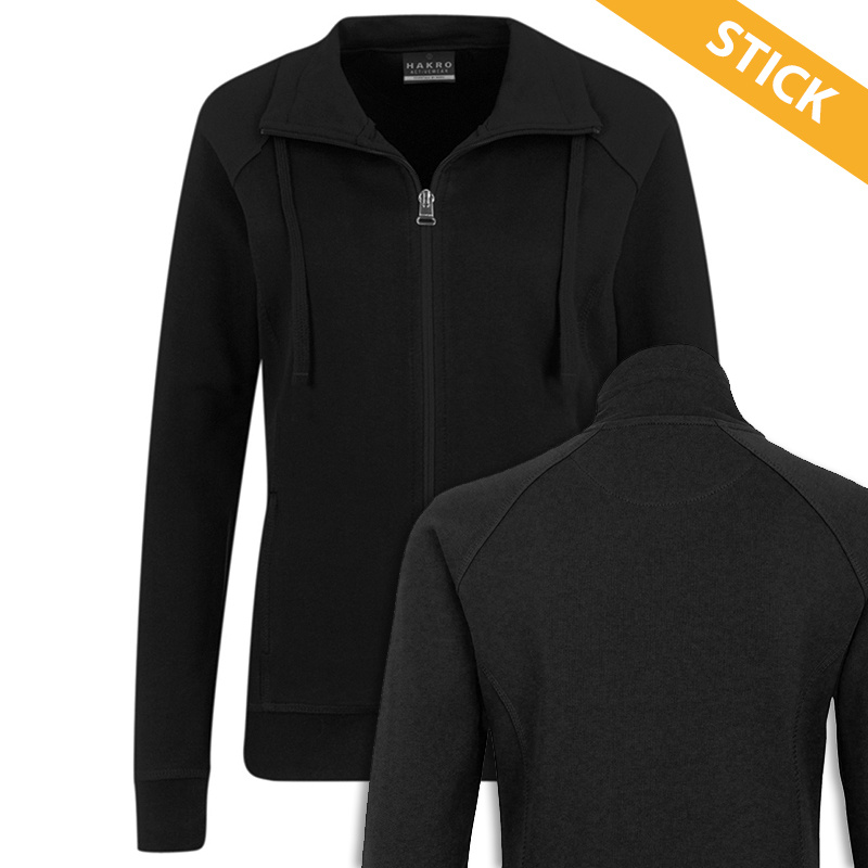 Sportliche Sweatjacke für Damen im College-Stil, mit Raglanärmeln, hochwertigem Frontreißverschluss von YKK®, formstabilen Bündchen mit LYCRA®-Anteil, Kragen mit Kordel und hochwertigen Metallösen von YKK®, Teilungsnähten mit dekorativer Flatlock-Steppung, nicht angerauter Innenseite (French-Terry), Nackenband und zwei praktischen seitlichen Einschubtaschen mit Reißverschluss. Hergestellt aus pflegeleichter Baumwolle-Polyester-Mischung für höchste Ansprüche. Gewebtes HAKRO-Necklabel aus hochwertigem Kettsatin mit weichen, ultraschallgeschnittenen Bandkanten für höchsten Tragekomfort und gewebtes HAKRO-Flaglabel an der linken Seitennaht..