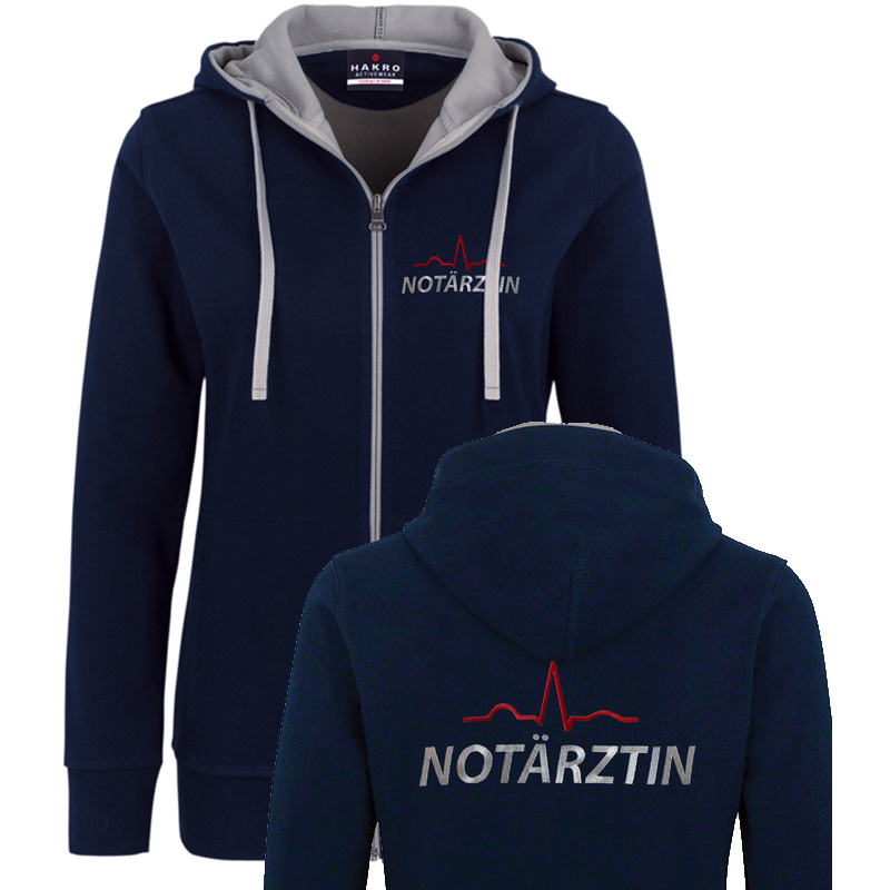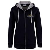 Aufwendig verarbeitete Kapuzenjacke für Damen, mit weichem, kontrastfarbigem Microfleece an der Innenseite, hochwertigem, kontrastfarbigem Frontreißverschluss, hochgeschnittener Kapuze mit kontrastfarbiger Kordel und hochwertigen Metallösen. Alle Reißverschlüsse und Ösen von YKK®. Formstabile Rippstrickbündchen mit LYCRA®-Anteil, Einschubtaschen mit Reißverschlüssen, Teilungsnähte für perfekte Passform mit dekorativer Flatlock-Steppung, kontrastfarbigem Halsspiegel und Nackenband. Hergestellt aus laminiertem 2-Lagen-Material mit einer Außenseite aus feinem Single-Jersey aus langstapeliger, gekämmter und ringgesponnener Baumwolle und einer Innenseite aus weichem Microfleece. Gewebtes HAKRO Necklabel aus hochwertigem Kettsatin mit weichen, ultraschallgeschnittenen Bandkanten für höchsten Tragekomfort und gewebtes HAKRO Flaglabel an der linken Seitennaht.