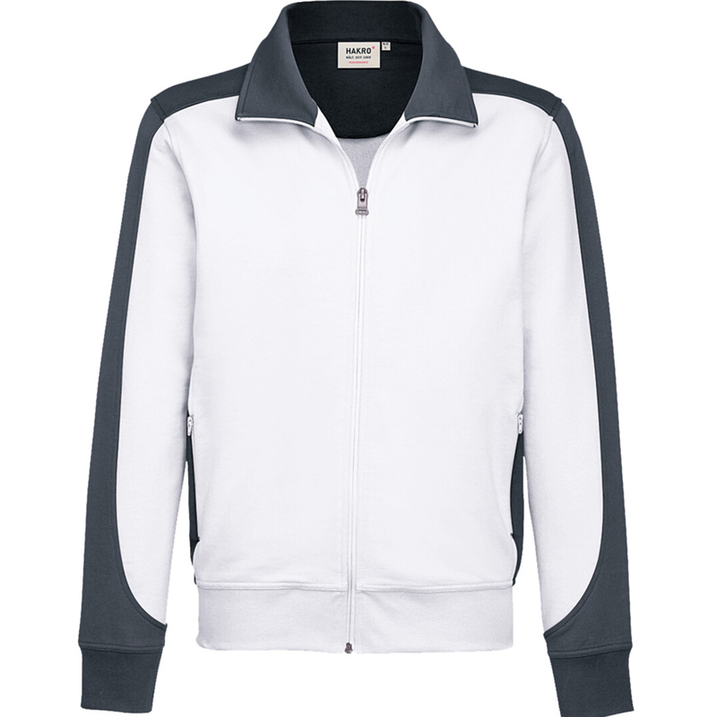 Besonders strapazierfähige Sweatjacke mit kontrastfarbigen Einsätzen an den Seiten, Schultern und Ärmeln, formstabilen Bündchen mit LYCRA®-Anteil, nicht angerauter Innenseite (French-Terry), Nackenband, hochwertigem Frontreißverschluss und seitlichen Einschubtaschen mit Reißverschluss. Alle Reißverschlüsse von YKK®. Leasingkoller zur einfachen Kennzeichnung in der gewerblichen Wäscherei und Aufhängebänder im Saum. Hergestellt aus weicher, besonders pflegeleichter und funktioneller Maschenware aus dem HAKRO Performance-Materialmix Mikralinar®. Gewebtes HAKRO Necklabel aus hochwertigem Kettsatin mit weichen, ultraschallgeschnittenen Bandkanten für höchsten Tragekomfort und gewebtes HAKRO Flaglabel an der linken Seitennaht.