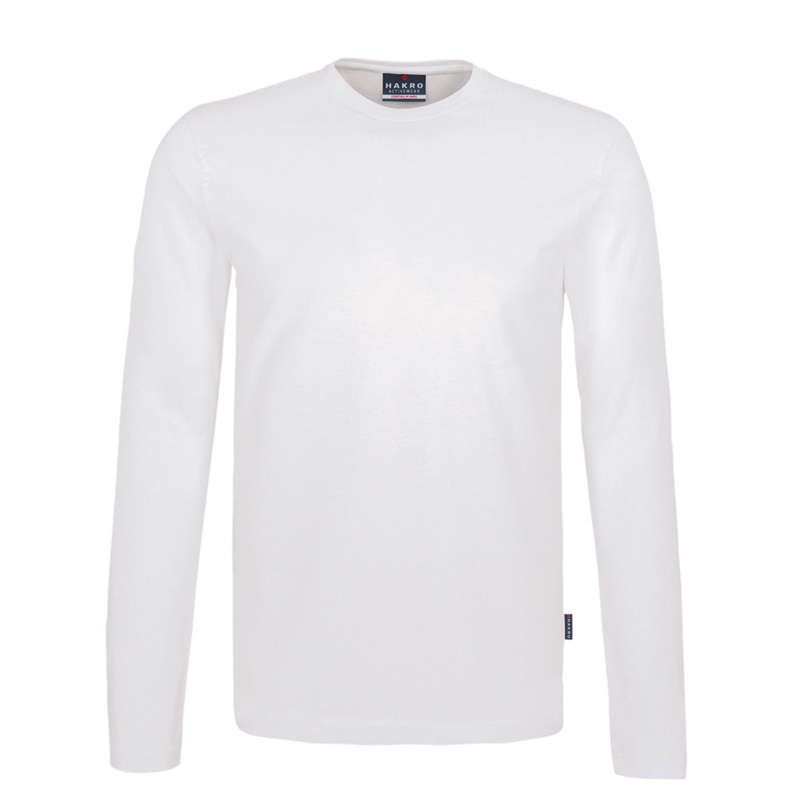 Klassisches Langarmshirt mit rundem Halsausschnitt, modisch schmalem, mit Elasthan-verstärktem Halsbündchen und Nackenband. Hergestellt aus schwerem, feinem Single-Jersey aus langstapeliger, gekämmter und ringgesponnener Baumwolle. Gewebtes HAKRO Necklabel aus hochwertigem Kettsatin mit weichen, ultraschallgeschnittenen Bandkanten für höchsten Tragekomfort und gewebtes HAKRO Flaglabel an der linken Seitennaht.