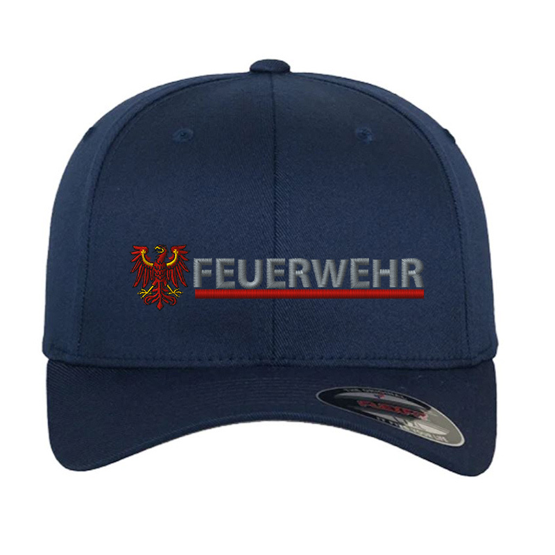 Inklusive Bestickung vorne mittig mit Logo Feuerwehr Brandenburg (Stick „FEUERWEHR“ in Silber mit Unterstrich in rot und Brandenburger Adler)