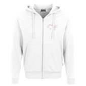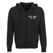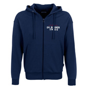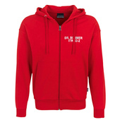 Sportive Kapuzen-Sweatjacke mit hochwertigem Reißverschluss von YKK®, gefütterter Kapuze mit Kordel und hochwertigen Metallösen von YKK®, formstabilen Rippstrickbündchen mit LYCRA®-Anteil, nicht angerauter Innenseite (French-Terry), Einschubtaschen und Nackenband. Hergestellt aus pflegeleichter Baumwolle-Polyester-Mischung für höchste Ansprüche. Gewebtes HAKRO-Necklabel aus hochwertigem Kettsatin mit weichen, ultraschallgeschnittenen Bandkanten für höchsten Tragekomfort und gewebtes HAKRO-Flaglabel an der linken Seitennaht.