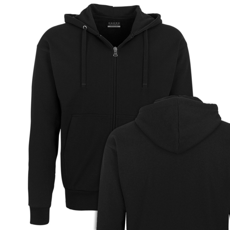 Sportive Kapuzen-Sweatjacke mit hochwertigem Reißverschluss von YKK®, gefütterter Kapuze mit Kordel und hochwertigen Metallösen von YKK®, formstabilen Rippstrickbündchen mit LYCRA®-Anteil, nicht angerauter Innenseite (French-Terry), Einschubtaschen und Nackenband. Hergestellt aus pflegeleichter Baumwolle-Polyester-Mischung für höchste Ansprüche. Gewebtes HAKRO-Necklabel aus hochwertigem Kettsatin mit weichen, ultraschallgeschnittenen Bandkanten für höchsten Tragekomfort und gewebtes HAKRO-Flaglabel an der linken Seitennaht.
