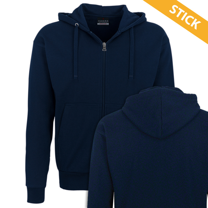 Sportive Kapuzen-Sweatjacke mit hochwertigem Reißverschluss von YKK®, gefütterter Kapuze mit Kordel und hochwertigen Metallösen von YKK®, formstabilen Rippstrickbündchen mit LYCRA®-Anteil, nicht angerauter Innenseite (French-Terry), Einschubtaschen und Nackenband. Hergestellt aus pflegeleichter Baumwolle-Polyester-Mischung für höchste Ansprüche. Gewebtes HAKRO-Necklabel aus hochwertigem Kettsatin mit weichen, ultraschallgeschnittenen Bandkanten für höchsten Tragekomfort und gewebtes HAKRO-Flaglabel an der linken Seitennaht.